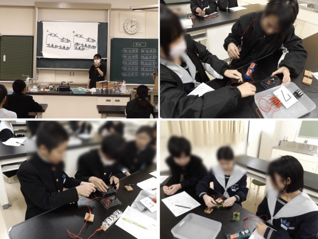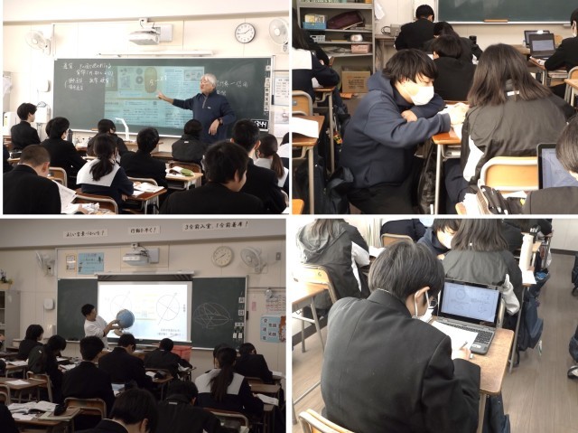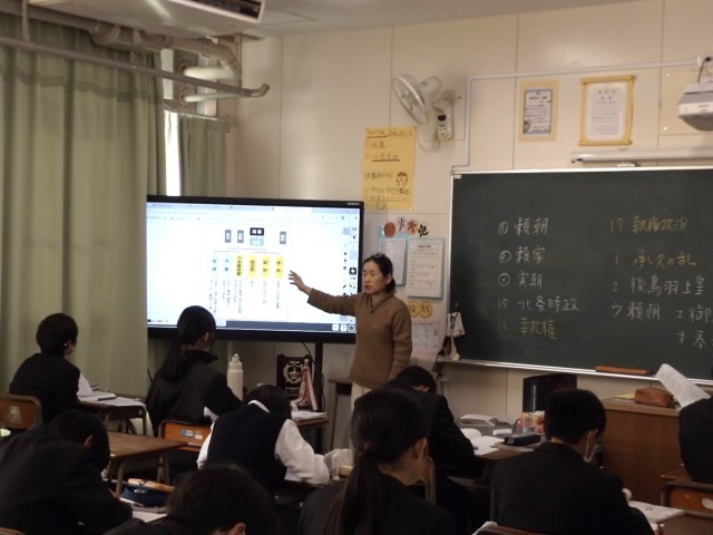 3年生では、社会は貨幣について、理科は地軸と季節の仕組み、数学は高校入試に向けた問題演習の授業です。2年生では、理科で直列回路と並列回路の違いにかかる実験をしました。1年生社会では、鎌倉幕府の仕組みや成立等について学習しました。電子黒板や学習者用端末を使って、視覚的にわかりやすく授業を行っています。