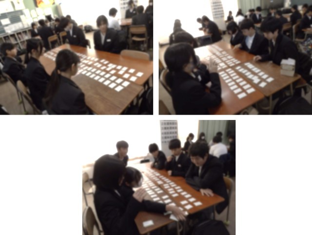 1年生では、1月30日の百人一首大会に向けて、各クラスで実戦練習を行いました。1枚でも多くとれるように、皆さん、真剣に練習に励んでいます。