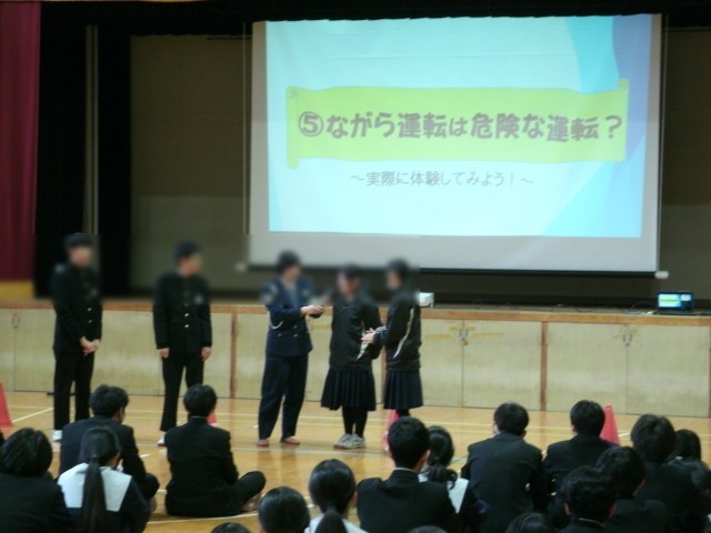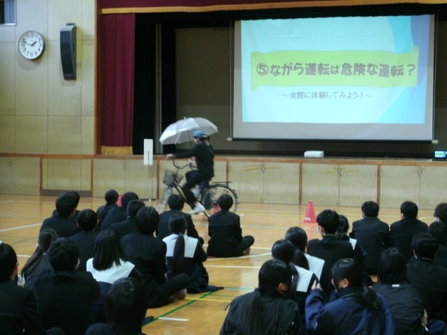 都島警察署交通課の方より、プレゼンテーションを使った説明や代表生徒による実演を行い、自転車の乗り方、道路上での走り方等について学びました。