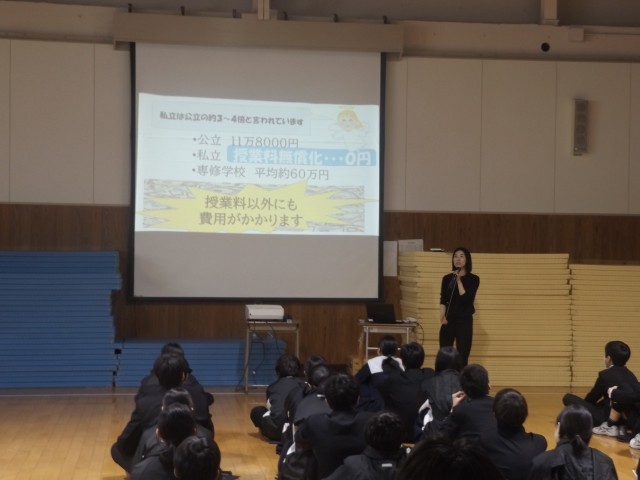 2年生では、来年度に控えている高校進学等の進路選択に向けて、進路学習を行いました。これまでの学校との違いや入学者選抜制度のあらまし等について学習しました。皆さん、1つも話を漏らしたくないと真剣に聞いていました。