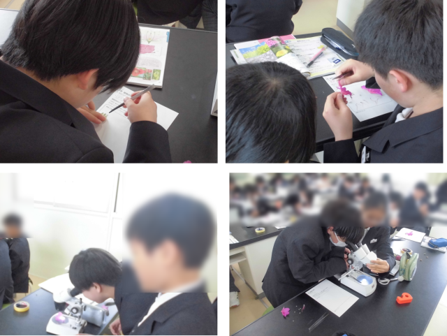 1年生の理科では、身近な生物や植物について学習しています。花を分解し、顕微鏡を使って、1つ1つのつくりを確認しながら、どのようなつくりで花が構成されているのか実際に花を分解して学習しました。