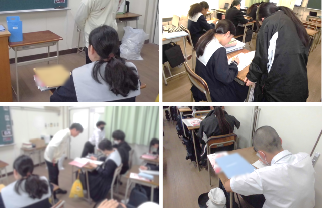 3年生の授業の様子です。数学では、因数分解を学習しています。問題演習では、教え合いをしたり、一人で黒板を見ながら解き方を考えたりして、問題に取り組んでいました。