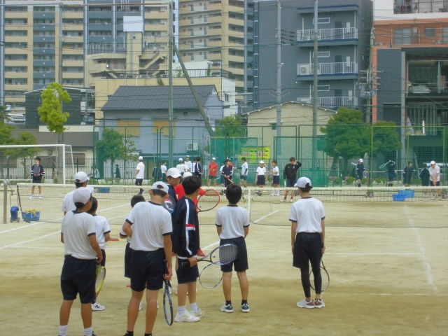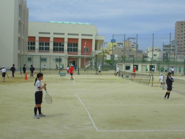 本日より、居住地確認が始まり、部活動も14時ごろからの長時間の活動になります。グラウンドでは、ソフトテニス部、硬式テニス部、サッカー部が活動しています。2、3年生が1年生にラケットの使い方やルール、サッカーでのゲームの進め方などを教えて、部活動を楽しんでいる姿がみられます。