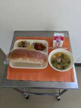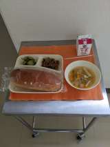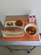【本日の献立】 牛肉のデミグラスソース煮 スープ きゅうりのピクルス パン 牛乳
