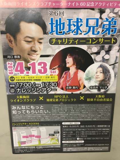 去る4月13日(土)17時30分より大阪梅田のグランフロント北館4階ナレッジシアターで第6回地球兄弟チャリティコンサートが開催されました。