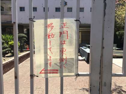 4月11日(木)から正門が移動しています。元あった場所から東へ90歩行ったところに移りました。