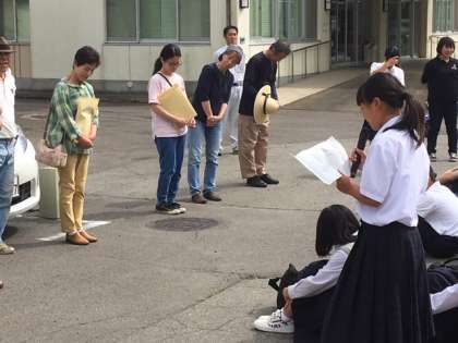 昼食後、少し時間が遅れ気味の出発でしたが、ほぼ予定通りの時間に入村式を終えました。写真は代表がお世話になる民泊先の皆さんにご挨拶をしているところです。どうぞよろしくお願いいたします。次は家業体験の様子をお伝えします。