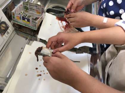 メニューは「いわしのかば焼きと小松菜のお浸し、それにご飯」です。左の写真はいわしを開く作業をしているところです。一人1尾ずつ開きます。1班5〜6人編成で、力を合わせて課題に取り組んでいました。