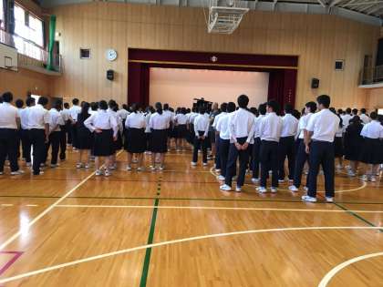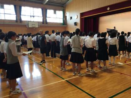 本日は土曜授業でした。3限目に、初の試みである全校生徒による全体合唱の練習を体育館で行いました。準備運動代わりに校歌を歌い、パートごとの練習をしました。中学校での全体合唱を初めて経験する1年生も楽しく、大きな声を出して歌っていました。本番は10月18日(金)の文化祭のラストを飾るものとなっています。300人近い人数で行う合唱は、子どもたちにとっても初めてのことだと思います。私たちも期待しています。