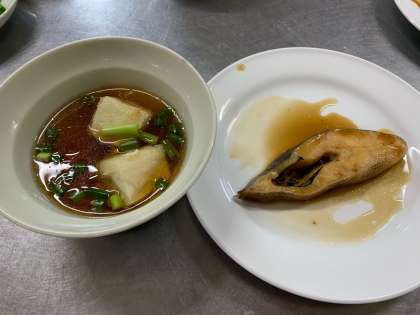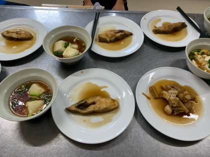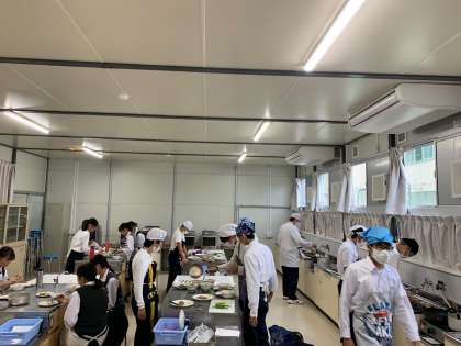 仮設校舎の調理室の作りの加減で、動線に問題があり、機能的であるとは言い難いですが、大人も子どもも力を合わせ、何とか調理仕上げました。大人でも「魚料理はちょっと…」と言う方もおられると思います。美味しそうに出来上がった「カレイの煮付け」を見て、子どもの力に感心しました。