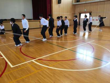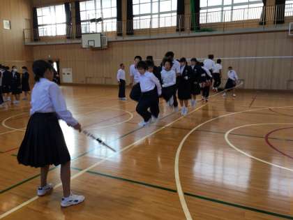 去る11月1日(金)6限に1年生の大繩大会が開催されました。10月31日(木)の午前8時からと試合当日の朝、午前8時から、朝練をやりました。いクラスが、AチームとBチームに分かれ、7分間で一番たくさん飛べたチームが優勝です。先週金曜日の朝もどのクラスも早くから集まって練習をしていました。試合結果は次にお知らせします。