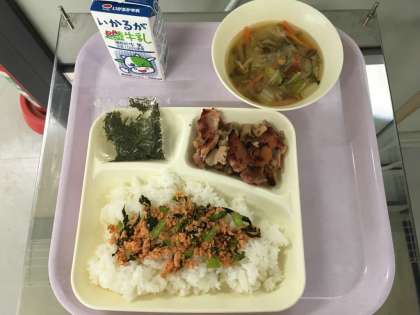本日の給食のメニューは学校給食献立コンクール優秀賞作品で、「さけとこまつなのご飯」、「豚肉とれんこんの甘味焼き」、「冬野菜のみそ汁」、「牛乳」でした。福島区野田小学校の昨年の6年生の作品です。献立のねらいは「野菜をいっぱい使って、5.6時間目も勉強が、がんばれるような給食」です。