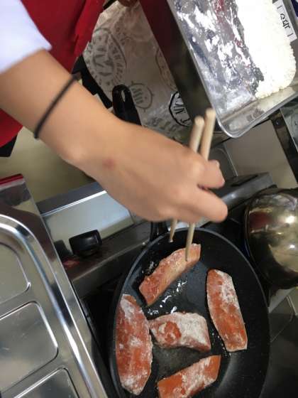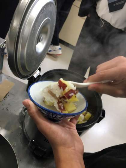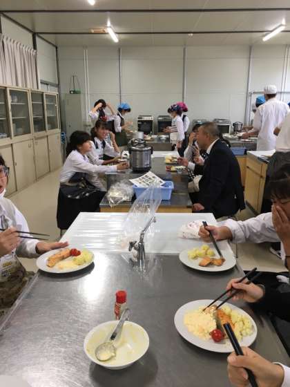 美味しそうにできあがった「鮭のムニエル」「さつまいもご飯」、校長先生もお相伴にあずかりました。