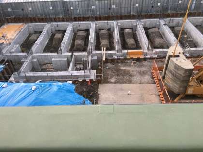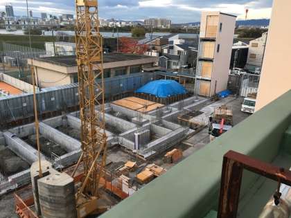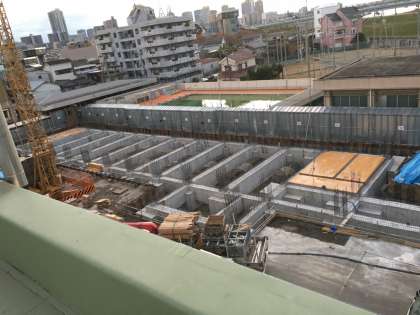 西館建て替え工事が着々と進んでいます。今日、東館の屋上から撮った写真です。これからコンクリートの枠組みいっぱいいっぱいまで埋め戻しが行われ、1階の土間の工事に移っていくそうです。少しずつ形になっていきます。