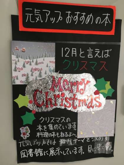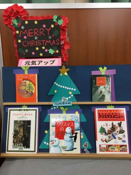 プレハブ校舎に掲示された12月の図書館のディスプレイの紹介です。図書館の展示はクリスマスの特集です。
