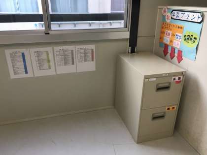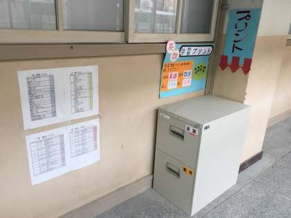 2年生の自主学習プリントコーナーはプレハブ校舎2階西側階段をあがったすぐのところです。