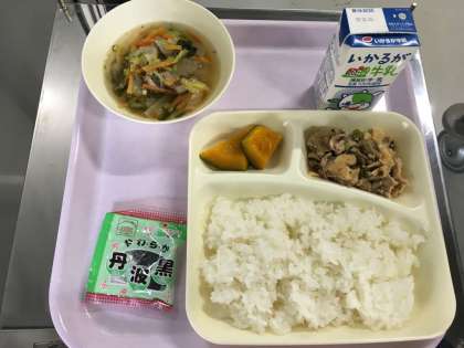 「豚肉と干しずいきのみそ煮、すまし汁、焼きかぼちゃ、ソフト黒豆、