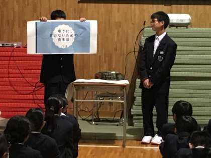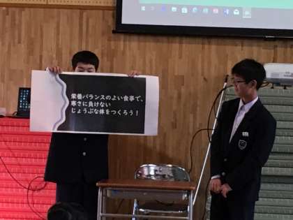 1年生は9月から毎月行われている食育の取り組みをインフルエンザ感染予防の取り組みと絡めて整備委員会で発表してくれました。整備委員会が作ったインフルエンザ感染予防啓発ビデオを流しながら、インフルエンザ対策の実践を訴えました。