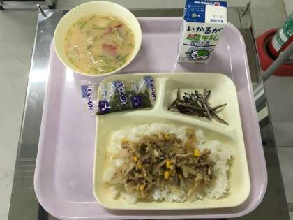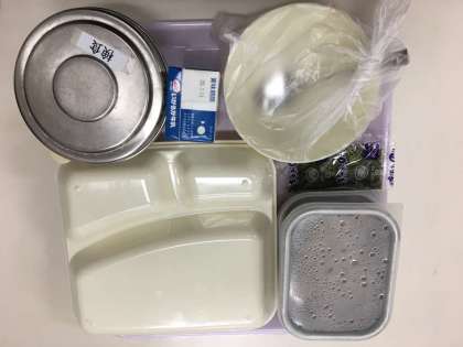 写真は本日の給食カレンダーと本日の給食、生徒が食べる前にする検食です。