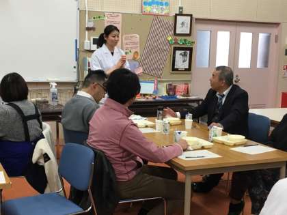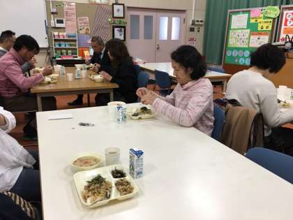 保護者の皆さんと一緒に給食をいただきました。本日はいつもと違って花ガツオでとった上品なお出汁で白みそ仕立ての関西風のぞう煮をいただきました。とてもおいしかったです。淀川小学校の梅村先生も試食会に来てくださって、保護者の皆さんからの質問に答えてくださいました。ありがとうございました。