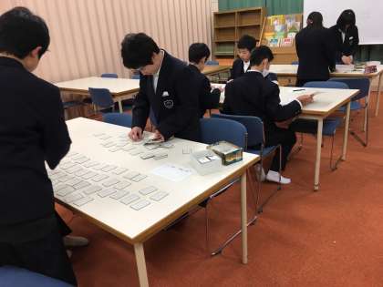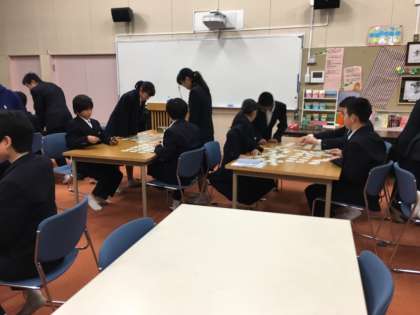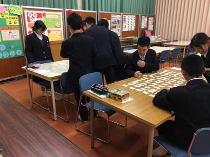 国語科の福田先生のお話によると、1年生の各クラスの百人一首の練習にかける意気込みは大変なもので、「始めます!」の号令とともに、全員がさっと立ち上がり、構えるそうです。大会当日は熱戦が繰り広げられると思います。1年生の皆さん、頑張ってください。期待しています。
