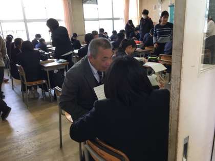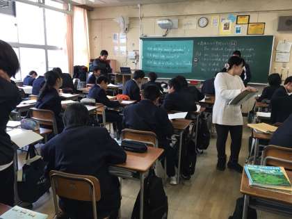 研究授業ということで、先生方がたくさん1年3組に参観に来られましたが、ものおじすることもなく、いつもと同じように、チャンツ、パフォーマンステスト、口頭練習、カードゲーム等粛々とこなしていました。2人1組の練習問題では相手のいない生徒が校長先生と組になって実習しました。入学してほぼ10か月ですが、1年生の英語もなかなか大したものです。これからも毎日コツコツ努力を続けてください!