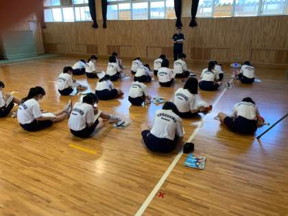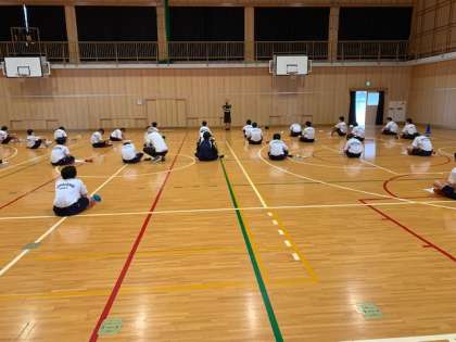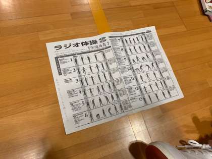 男女に分かれてラジオ体操のポイントの説明を聞いています
