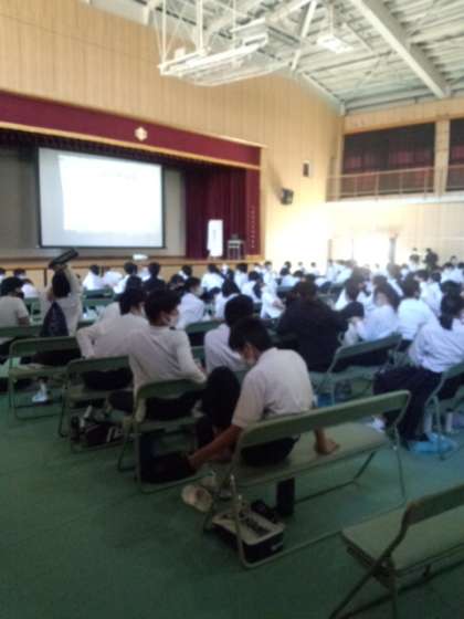 午前の部が終わりました、体育館で映像を見たクラスと展示見学したクラスが入れ替わって午後の部となります。その前にお昼ごはん、今日はお弁当です。