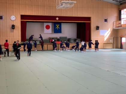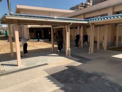 1年生は体育館の外まわり、2年生は体育館の中を整備しています。