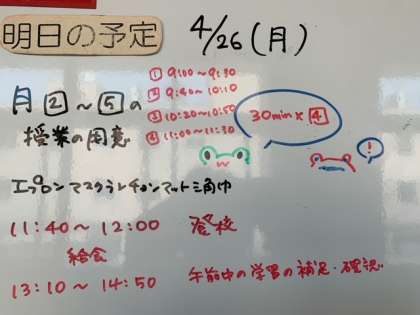 明日は、午前中家庭で学習し、お昼に登校となります。