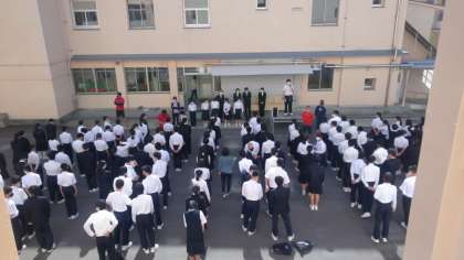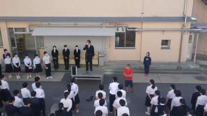 実習生あいさつの後、いじめについて考える日ということで、生徒会役員と校長先生から、お話がありました。