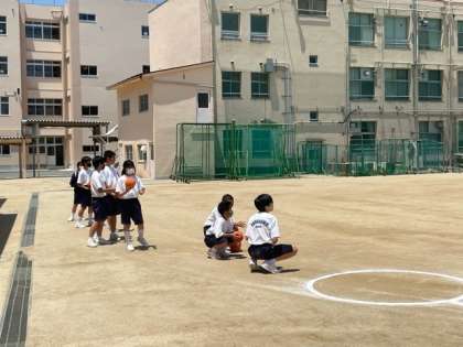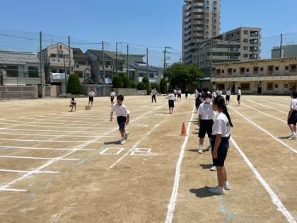先生の説明を聞いた後、投げる人、測る人、拾う人に分かれて練習です。