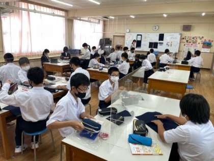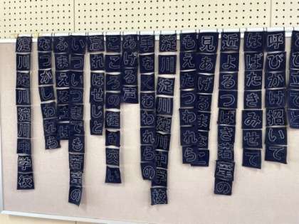 被服室の後ろには、校歌の刺し子が飾られていました。