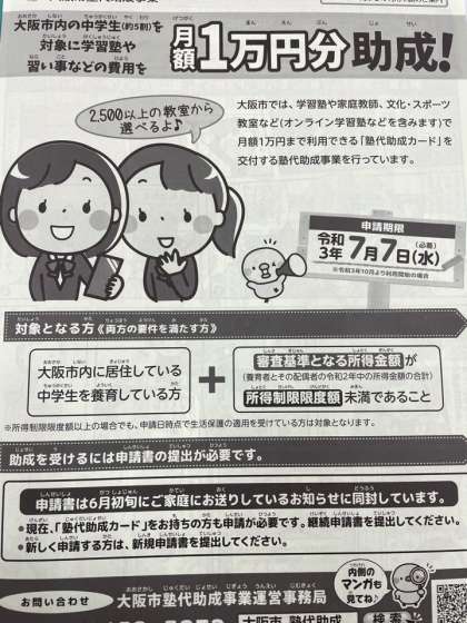 大阪市塾代助成事業の案内を、本日配布します。