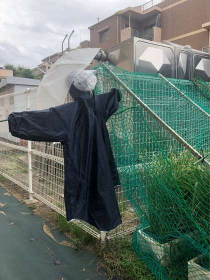 このままでは収穫自体が厳しくなるため、さらに対策を強化し、案山子を置くことにしました。