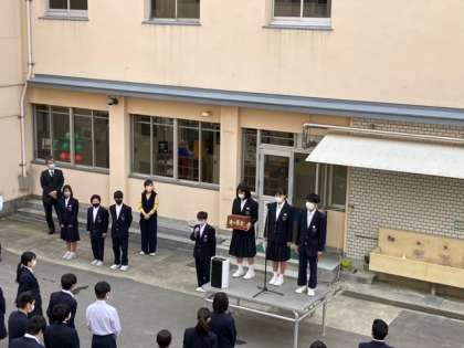 次に、生徒会役員から赤い羽根共同募金について説明がありました。