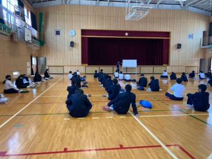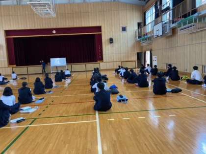 体育館で授業の受け方について説明を受けています。