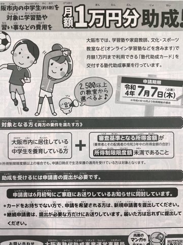 大阪市の塾代助成事業について、本日配布いたしました。ご活用ください!