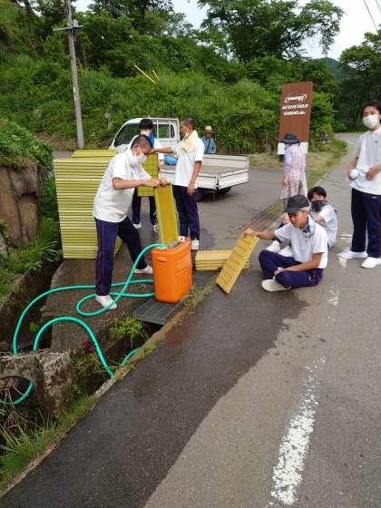 苗を入れるケースを洗っています。