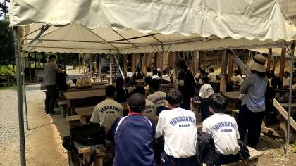 カレーを作る前に説明を受けています。