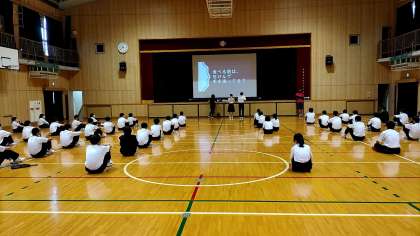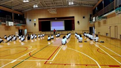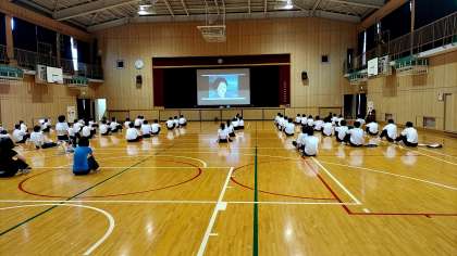 2年生は学年集会の後、平和学習でおかあさんの木を鑑賞しました。