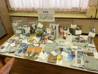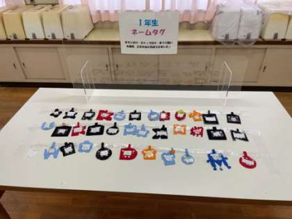 被服室では、家庭科の授業で作った作品が展示されています。1年生は「ネームタグ」、2年生は「給食献立コンクールに応募したレポート」、3年生は「エコバッグ」を制作しました。