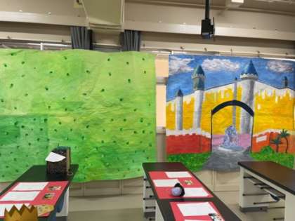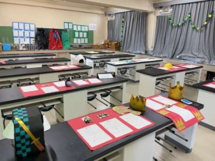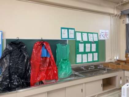 理科室では、3年生の劇に使用された背景や衣装などが、制作者の声とともに展示されています。