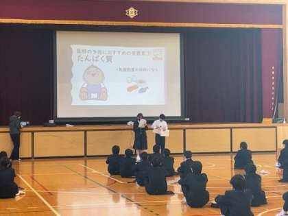 今日の学年集会では、整美委員から「風邪を予防するための食事」についての発表がありました。