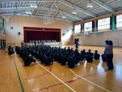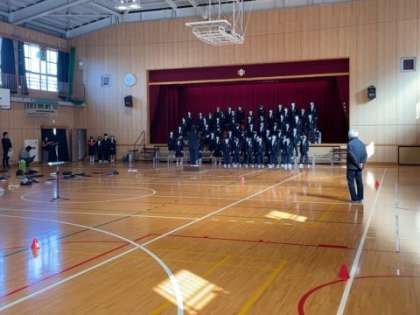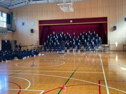 「卒業生を送る会」に向けて、1,2年生が全体練習をおこなっています。当日の流れや移動について確認をしています。
