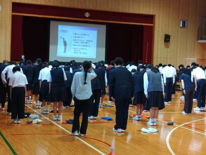 本日四時間目に体育館で全学年対象に着こなしセミナーが行われました。学生服メーカーのカンコウさんから講師の方をお招きして、標準服の着こなし方や第一印象の大切さについて分かりやすく説明していただきました。