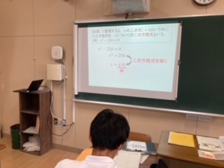 「2次方程式の解き方」をスライド(パワーポイント)を用いて、視覚的にも分かりやすく説明をされていました。