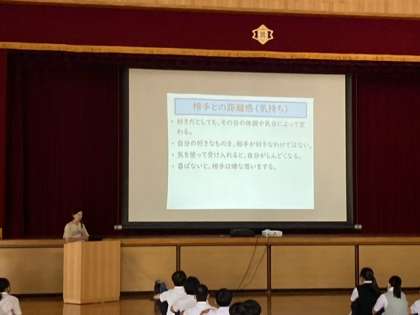 「人とのつき合い方」「男女交際」「デートDV」などのテーマを本校養護教諭の永安先生が講話をしました。
