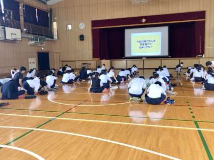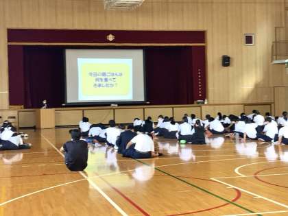 2年生は6限目に体育館で「成長期の運動と食事」の授業を行いました。