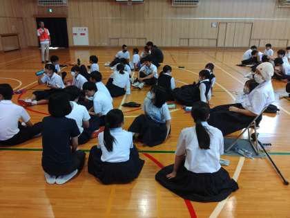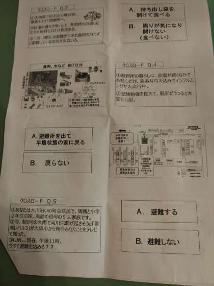3年生は体育館で区役所防災担当の方からクロスロード防災ゲームについて指導を受けました。(写真のプリント参照)
